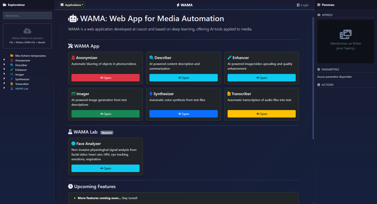WAMA, « Web App for Media Automation », est une application web développée au Lescot et basée sur l'apprentissage profond, proposant des outils d'IA appliqués aux médias. Ces outils seront ajoutés au fur et à mesure des développements.